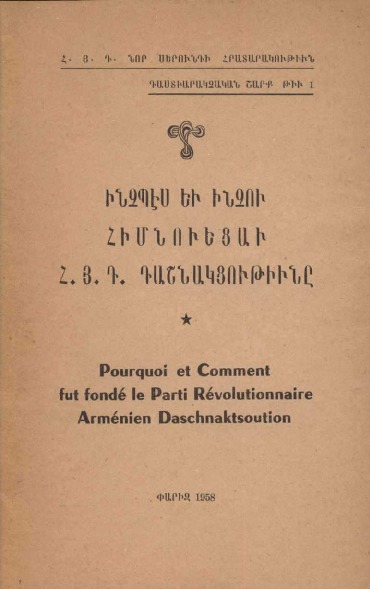 Brochure bilingue de présentation historique du Parti Révolutionnaire Arménien Daschnaktsoution Publié en 1958. 30 pages.