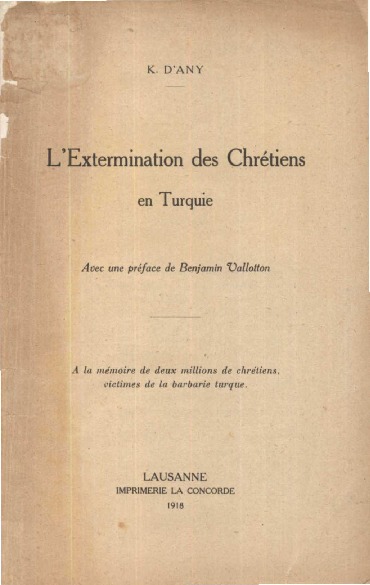A la mémoire de deux millions de chrétiens victimes de la barbarie turque. 32 pages. Publié à Lausanne en 1918.