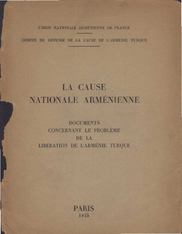 Documents concernant le problème de la libération de l’Arménie turque. Requête, mémorandum et résolutions envoyés par la Comité de défense de la cause de l’Arménie Turque eux Ministres des Affaires Etrangères des cinq grandes puissances réunis à la conférence de Londres. 69 pages. Publication à Paris en 1945.