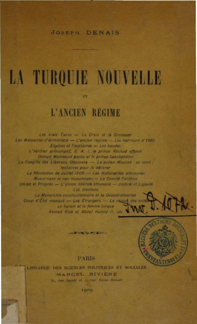 Les vrais Turcs- La Croix et le Croissant – Les Massacres d’Arméniens – L’Ancien Régime – les horreurs d’Yidiz – Espions et Faussaires – Les bandes – L’héritier présomptif, S.A.I.le Prince Réchad effendi – Damad Mahmoud pacha et le prince Sabaheddine – Le Congrés des Libéraux Ottomans – le Sultan Mourad : sa mort ; … Lire la suite