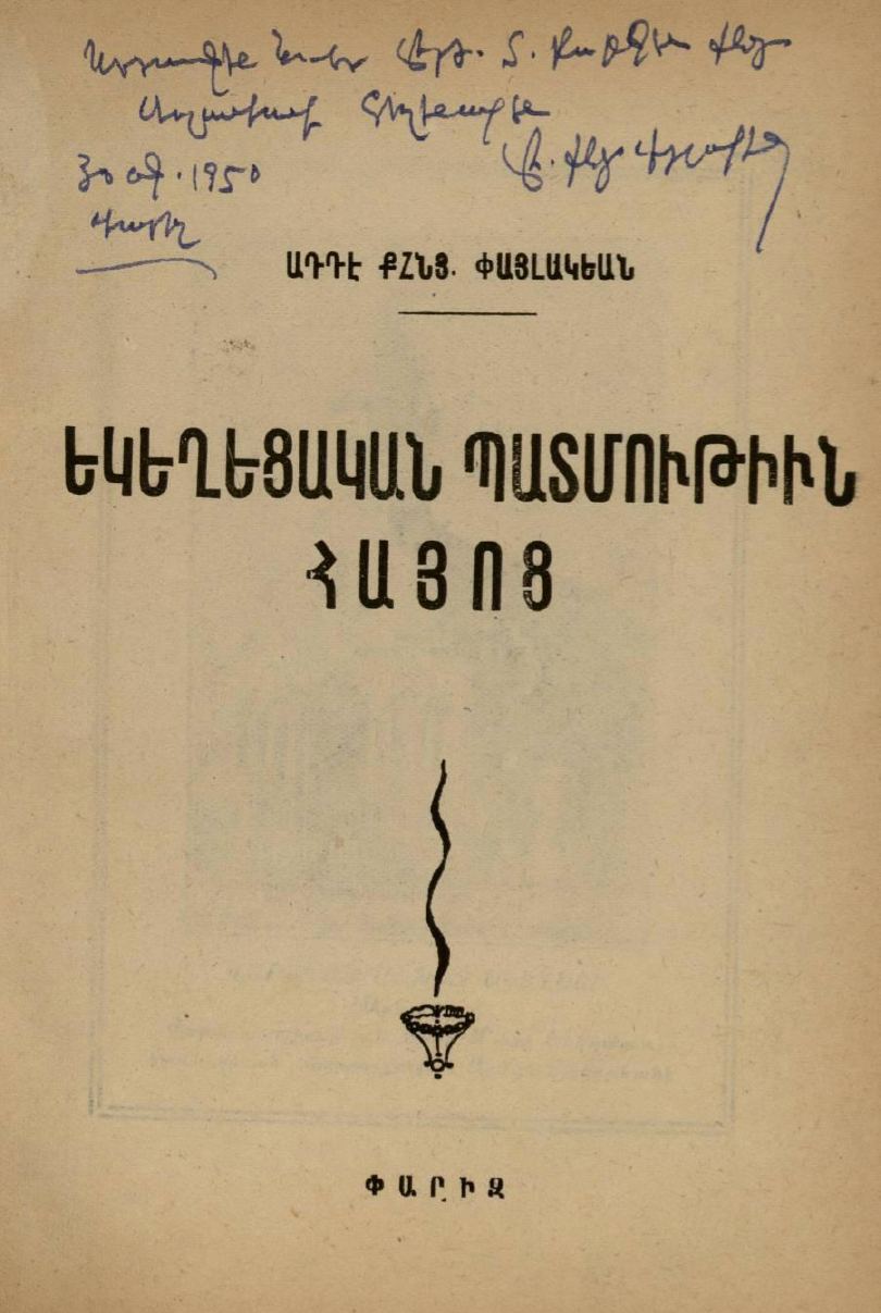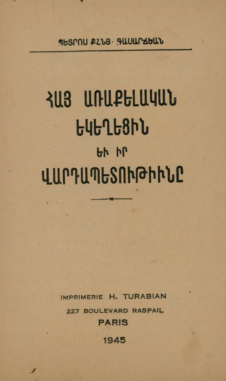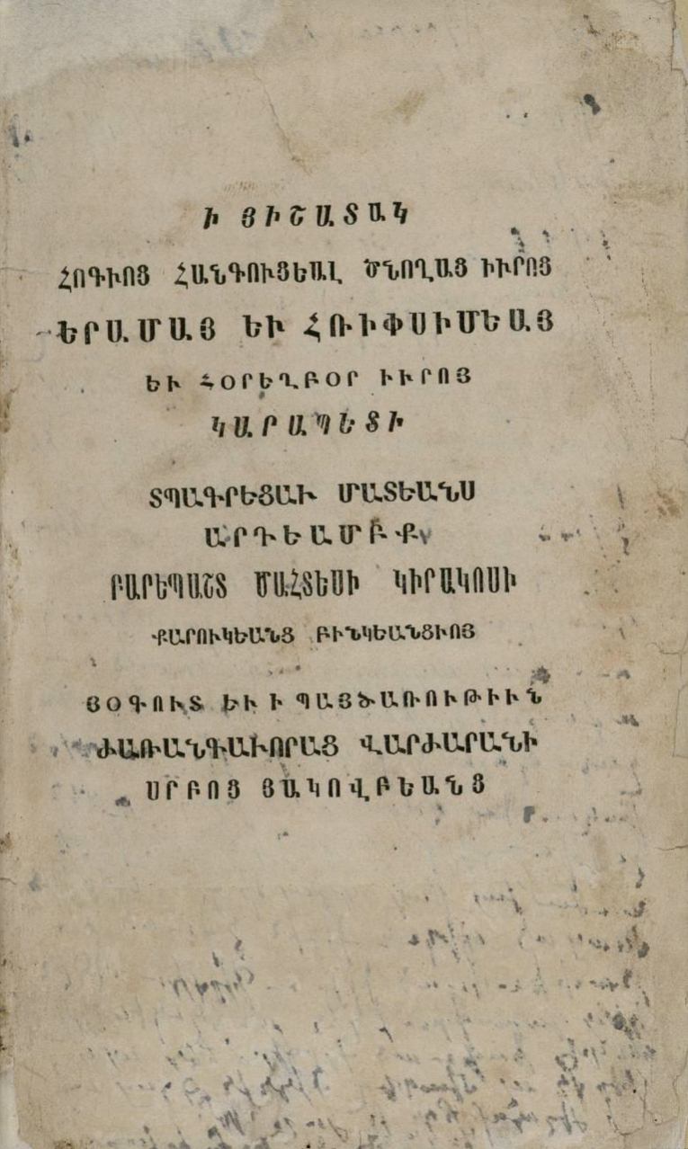 Le livre était édité ou imprimé ‘par le mécénat’ (=artyampkt, arm. moderne: ‘artunkov’ = par le mérite) de Mahdéssi Guiragos, mahdéssi étant le titre de quelqu’un qui avait fait le pèlerinage à Jérusalem, notamment au monastère arménien de St-Jacques, et le livre est dédié à ce Centre monastique.