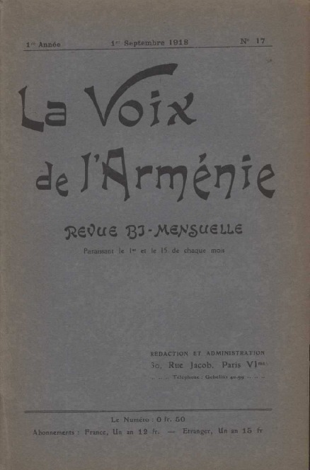 17ème numéro de la Voix de l’Arménie publié le 1er septembre 1918 à Paris. 36 pages.