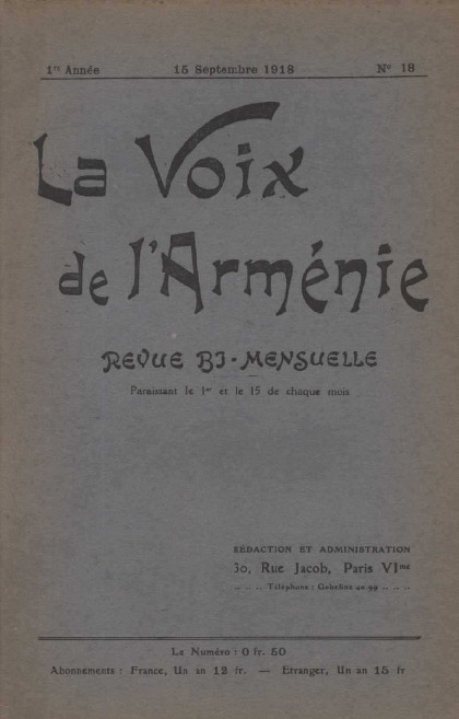 18ème numéro de la Voix de l’Arménie publié le 15 septembre 1918 à Paris. 36 pages.