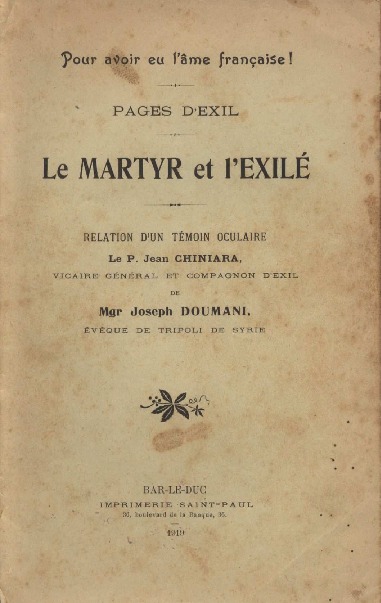 Le Martyr et l’Exilé – pages d’exil, relation d’un témoin oculaire. Témoignages du Pasteur Jean Chiniara, vicaire général et compagnon d’exil de Monseigneur Joseph Doumani, Evêque de Tripoli de Syrie. Publication en 1919 à Bar-le-Duc 130 pages.