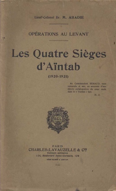 Opérations au Levant. « Onze mois dans le Verdun turc ». Récit des opérations militaires autour de la ville Aïntab. Publication Charles-Lavauzelle et compagnie à Paris en 1922. 148 pages.